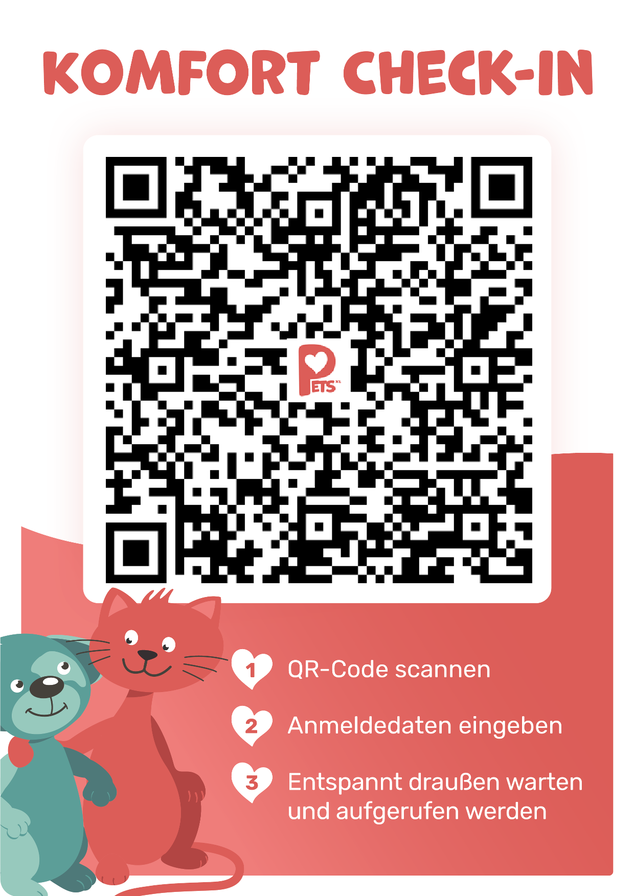 Ankommen, petsXL QR-Code scannen, fertig: So einfach checkst du in eurer Tierarztpraxis ein. Falls ihr warten müsst, geht ihr spazieren oder bleibt entspannt im Auto sitzen: denn deine Praxis schickt dir eine Push-Nachricht, wenn ihr an der Reihe seid.